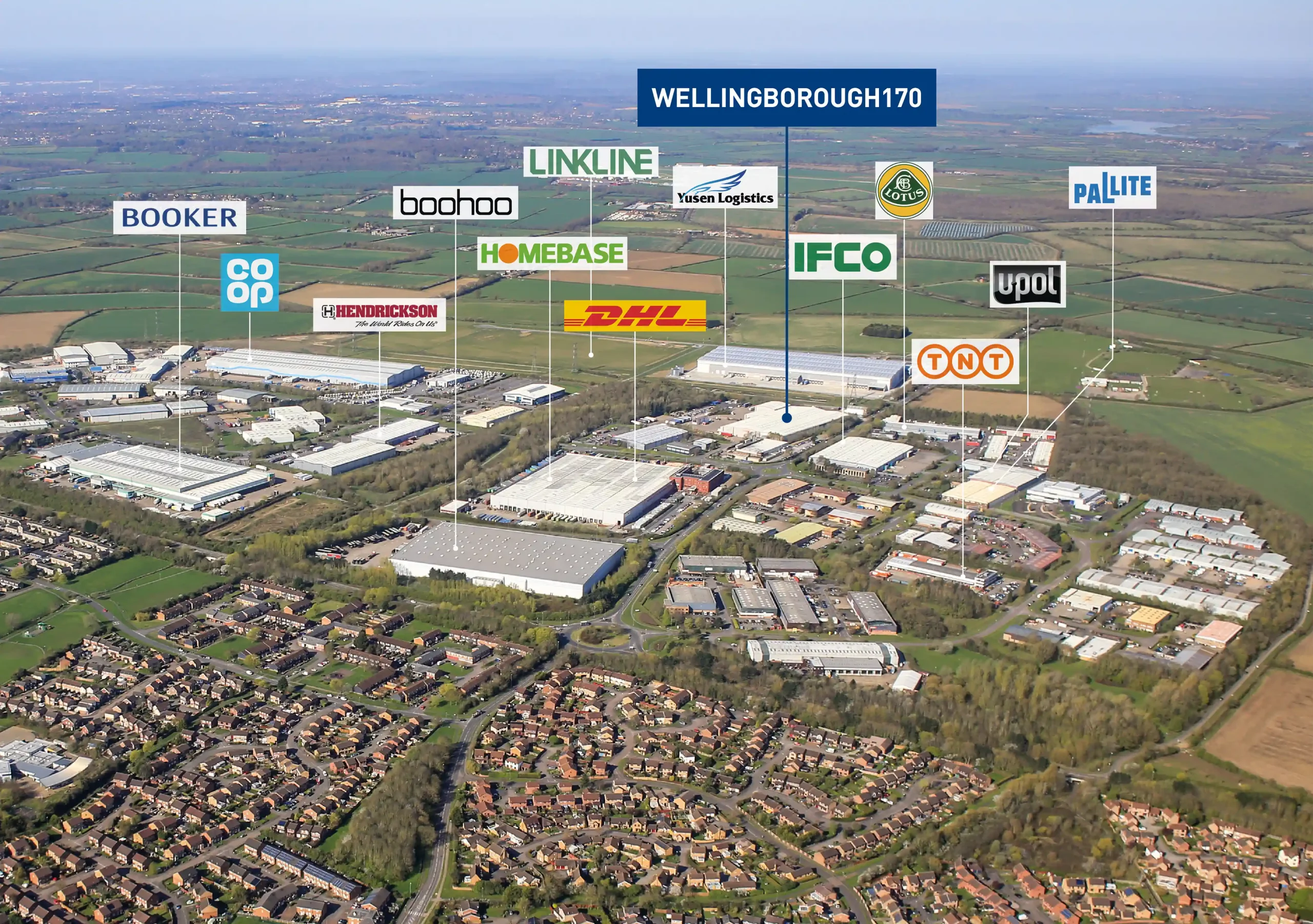 A modern distribution facility with extensive yard undergoing comprehensive refurbishment. Wellingborough 170 is situated on Park Farm Industrial Estate, a prime logistics location which is home to several high-profile occupiers including Yusen, Co-Op, Boohoo and Linkline. Located at the crossroads of the A45 dual carriageway and the A509, it offers easy access to the M1 motorway.